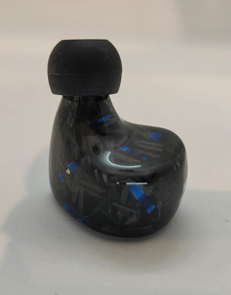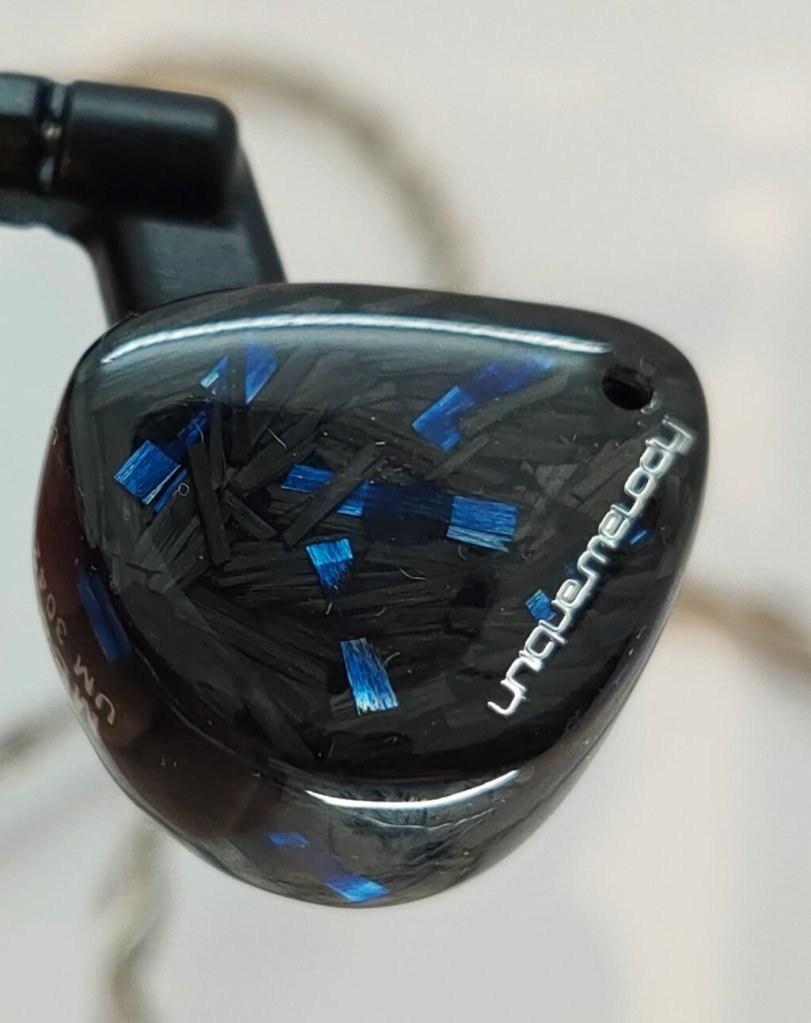 The MEST itself comes in two colour ways: red or blue. The shells themselves are a sort of translucent dark grey, with strands of blue or red carbon fibre running through the faceplate and the rest of the outer shell, alternating with reflective dark grey carbon fibre stripes.You can’t actually see the internals of the MEST, but the “under the surface” impression the CF strips give does add a nice visual impression of depth to an otherwise simple and clean design. The faceplates are adorned with a silver UM logo on the left shell and the full written unique Melody logo on the right, in “squint-and-you’ll miss it” font sizing to make sure it fits across the width of the IEM. Again, it’s understated, but I think it’s pretty classy and adds a nice feel of sophistication to the visuals. UM were actually pretty limited in terms of options here, as the faceplate is made from carbon fibre and forms an integral part of the whole bone conduction design, so has to be fully CF in order for the magic vibrations to make their way down the IEM shell. Given that restriction, I think they have done a pretty good job.