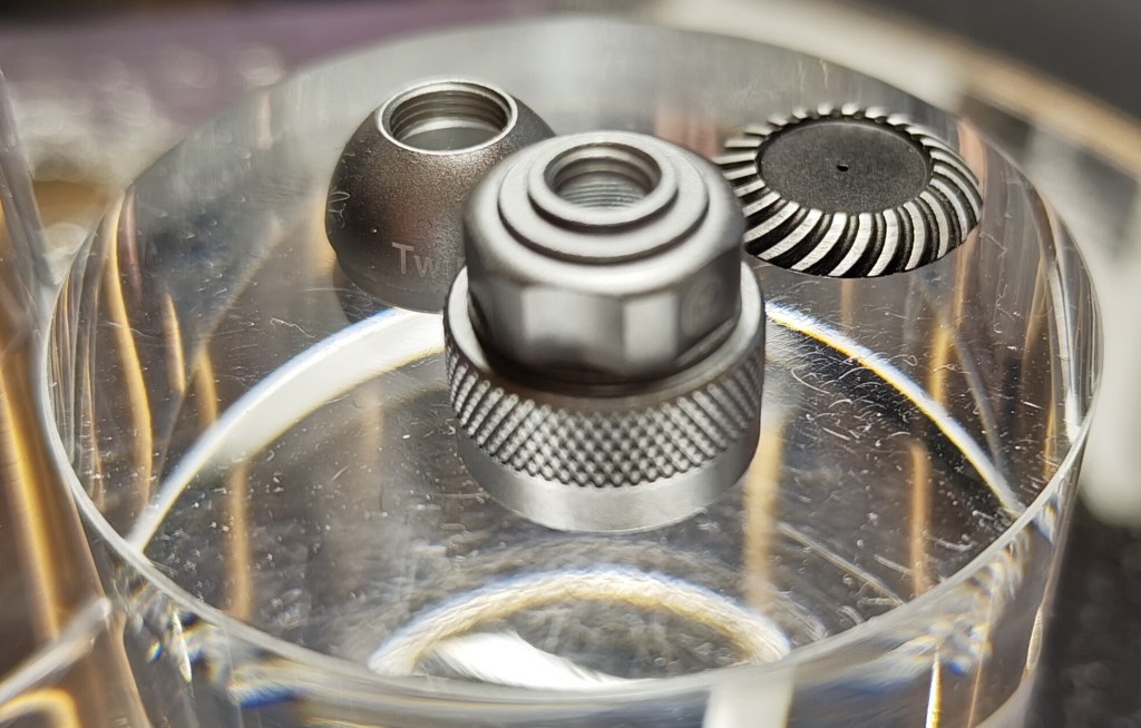The IEM is a entirely CNC machined from aluminium, with a pretty unique shell design that looks vaguely reminiscent of a really ornate bullet. Even more unique is the fit – it actually slots into the ear very nicely with foam tips, but it is designed to point into the ear with the IEM cable mounted almost perpendicular to the barrel. It’s basically a steampunk riff on the old school Sony XBA-Z5 or EX1000 – pretty eye catching and more than a little unusual compared to the more modern pseudo-custom IEM designs, but it’s comfortable enough. Foam tips are recommended by the designer to ensure a uniform fit and seal, but I suspect the rubbery Xelastec tips from AZLA will also work well here, and help with fit.