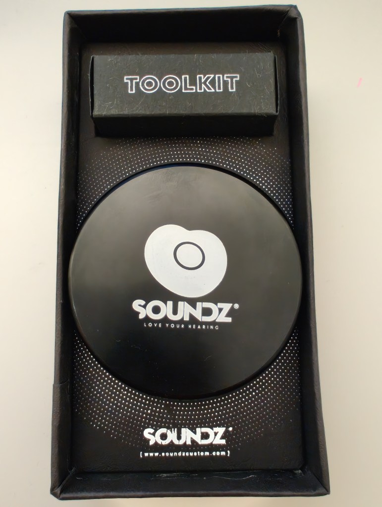 The Flame come in a nicely compact cardboard presentation box, with a nice Soundz graphic and the model name on a paper-effect sleeve. Sliding off the sleeve and opening the box reveals a black paper insert welcoming the purchaser to the Soundz family (which also doubles as a warranty card), a solid metal puck-style case with the Soundz logo on, some nice monochrome graphics and a small cardboard insert with the word “Toolkit” emblazoned on it. Opening up the toolkit, you will find some standard accessories (IEM cleaning brush, micro fibre polishing cloth and assorted ear tips in both silicon and hybrid silicon/foam design) and some non standard accessories (a guitar plectrum with the Soundz logo and a Soundz sticker). Finally, unscrewing the metal puck reveals the IEMs themselves, and a nice silver coloured 2-pin cable.