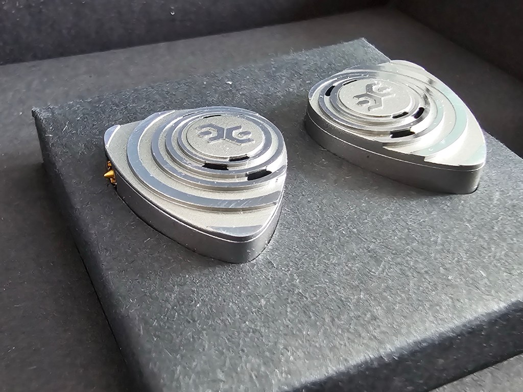 The entire shell is made of metal, with the faceplate carrying an intricate design of concentric polished and matte circles, with the Elysian “EE” logo forming a focal point in the middle of the circles. The circles also raise slightly as they get smaller, giving a nice 3D effect to the faceplate and an interesting texture in the hand. Another unusual feature of the faceplate are the multiple vent holes – there are 6 small holes on each faceplate, providing ample ventilation for the dynamic driver. Isolation is still pretty good, given the solid metal nature of the shell, but these won’t be the most isolating things you can use given the sheer amount of vent holes.