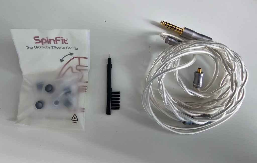 The cable itself is a thick silver looking cable with Elysian branding on the y-split. It is a 2-wire cable with a relatively thick gauge, and looks visually impressive, matching the colour of the IEMs and the case. The wire uses preformed heat shrink tubing on each earpiece as an ear guide – it’s soft and supple, but makes sure the cable drapes nicely over the ears in use. While I only have one other Pentaconn IEM cable to swap with, I probably wouldn’t think about cable rolling anyway, as the stock cable definitely looks “good enough” for the Pilgrim both in terms of looks and build.