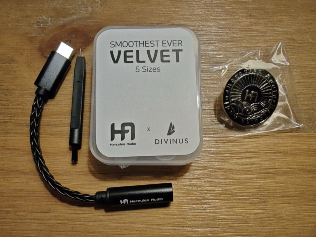 The rest of the loadout is similar – the Noah sports one aftermarket quality cable (the 4-wire Arc from its own range) vs the Ares 8-wired cabling on the Quantum, an IEM cleaning tool and a set of branded tips from Divinus (the Velvet) instead of the Tri Clarions packed by Fatfreq. The only difference is the USB-C to 4.4mm phone dongle included by Hercules Audio, which allows the Noah to be run from any mobile or PC device sporting USB-C. The audio quality is surprisingly good for a bundled dongle, so this additional piece of hardware is a thoughtful touch for when you just want to grab your IEMS and phone and go.