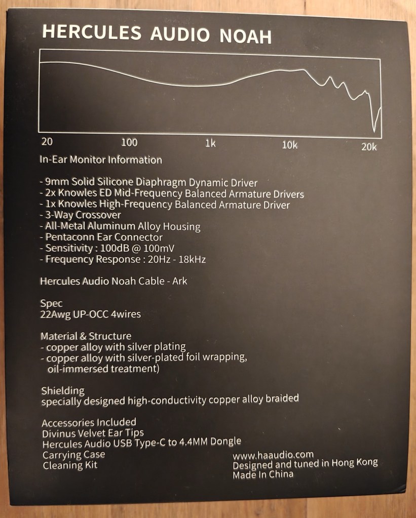 The Noah comes in a pretty impressive package for the price. The packaging is shoebox sized, with an illustrated sleeve showing a nice glamour pic of the Noah on the front and an array of tech specs on the back (see below). Slipping the cardboard sleeve off and opening the box itself, you are presented with the IEMs themselves in a foam cutout, along with a mid-sized carrying case. Opening the case reveals some Divinus tips, a usb-C to 4.4mm DAC/dongle adapter and a standard IEM cleaning tool. The initial units also included a Hercules Audio in badge, which is a nice touch.
